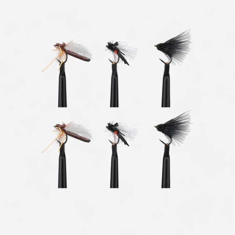 Notre équipe de pêcheurs a développé ce pack de mouches sèches pour la pêche à la mouche en surface des truites, ombres et poissons blancsSélection de mouches sèches imitant des insectes terrestres plutôt destinées à la pêche en lac. Chaque modèle est proposé en 2 exemplaires